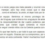 膝の怪我でイングランド戦に出場できないウルグアイのルガーノ主将が、チームメイト宛に書いた手紙。「君たちの責任感と勇敢な態度に感謝している。君たちは私の誇りだ」・・・大袈裟だと思われるかもしれませんが、彼らにとってW杯とはこういうもの。 https://twitter.com/chizurufgarcia/status/479688928455589888/photo/1